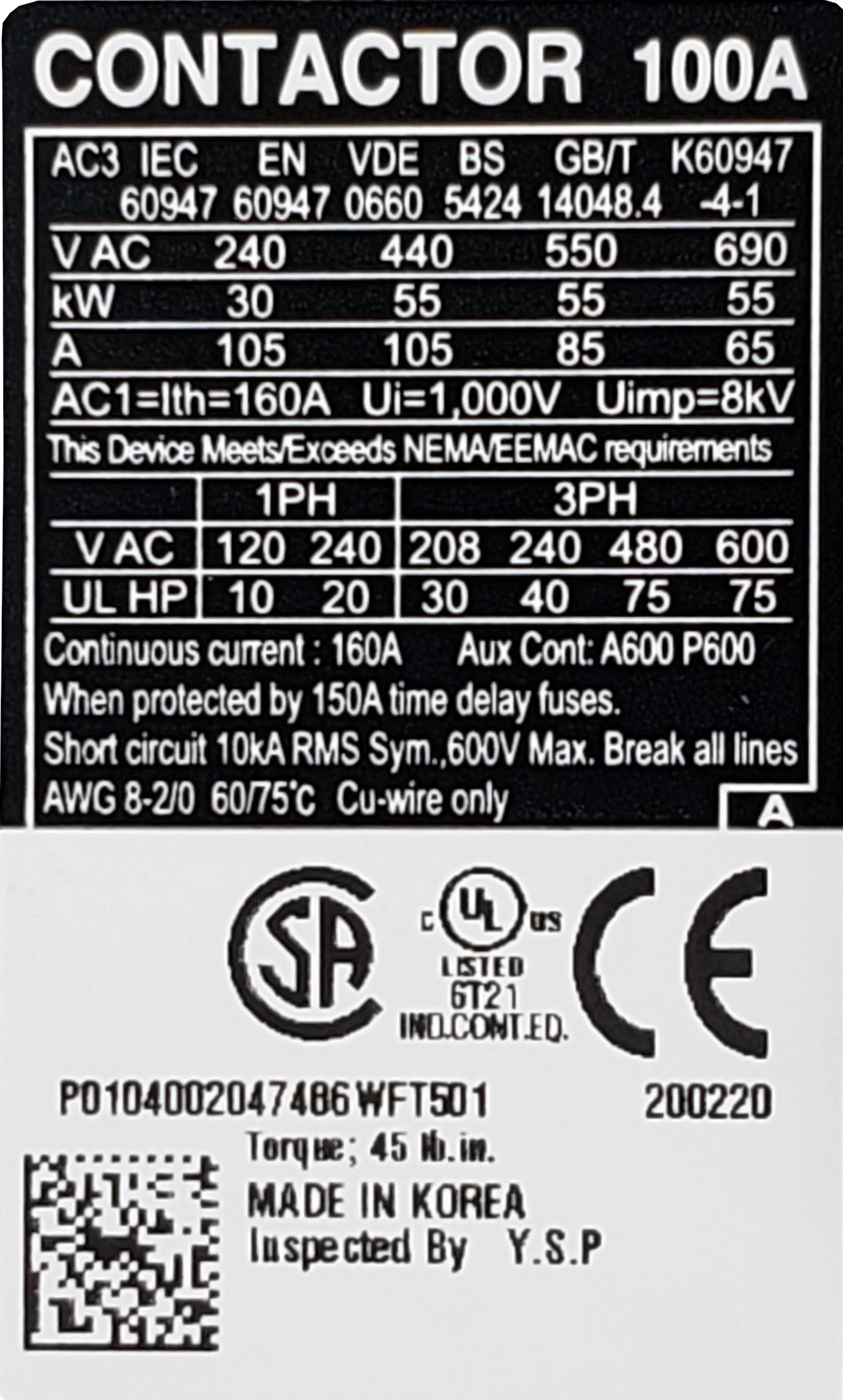 Carlo Contactor, 100A, 240v, 3ph, Lug, 2NO 2NC Aux