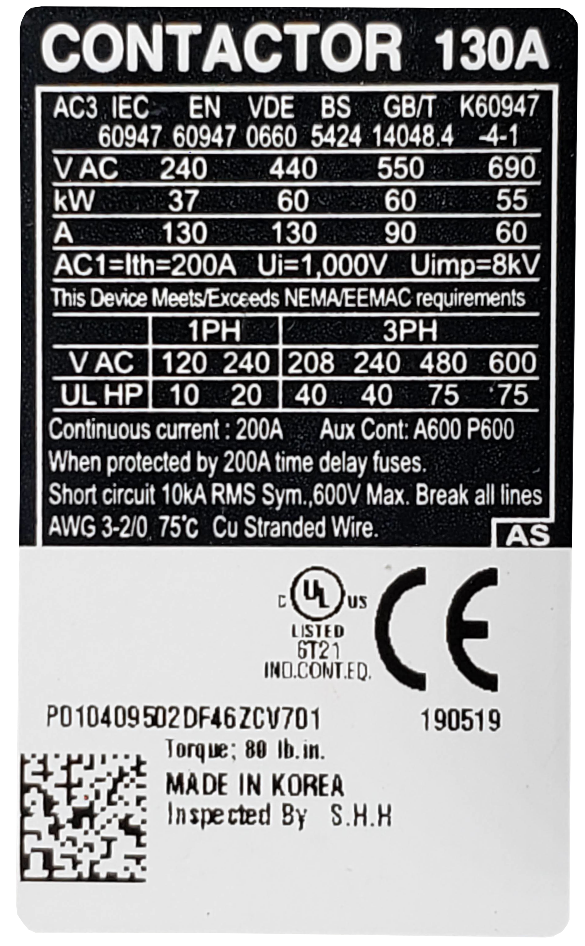 Carlo Contactor, 130A, 220v, 3ph, Lug, 2NO 2NC Aux