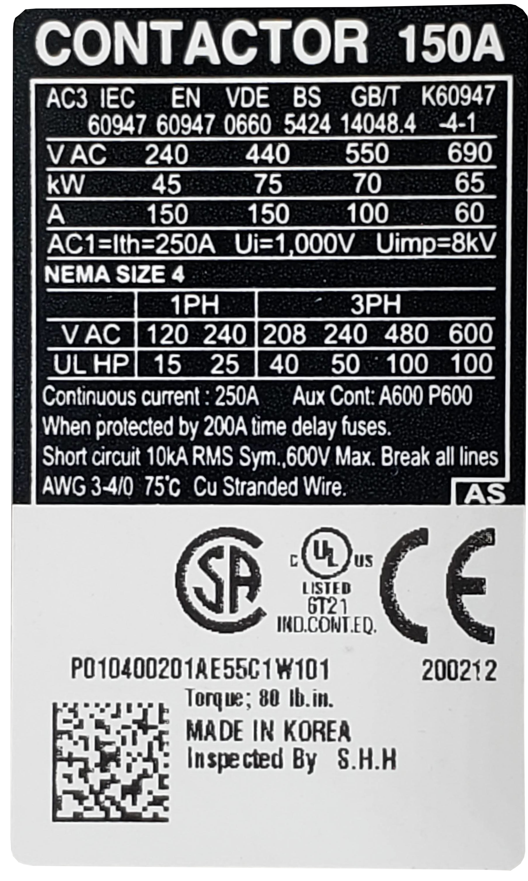 Carlo Contactor, 150A, 220v, 3ph, Lug, 2NO 2NC Aux