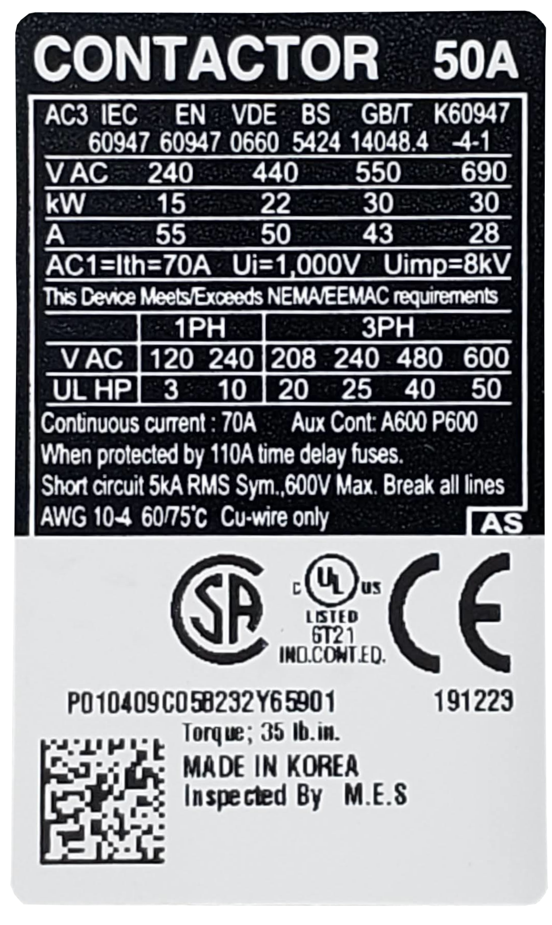 Carlo Contactor, 50A, 240v, 3ph, Lug, 2NO 2NC Aux