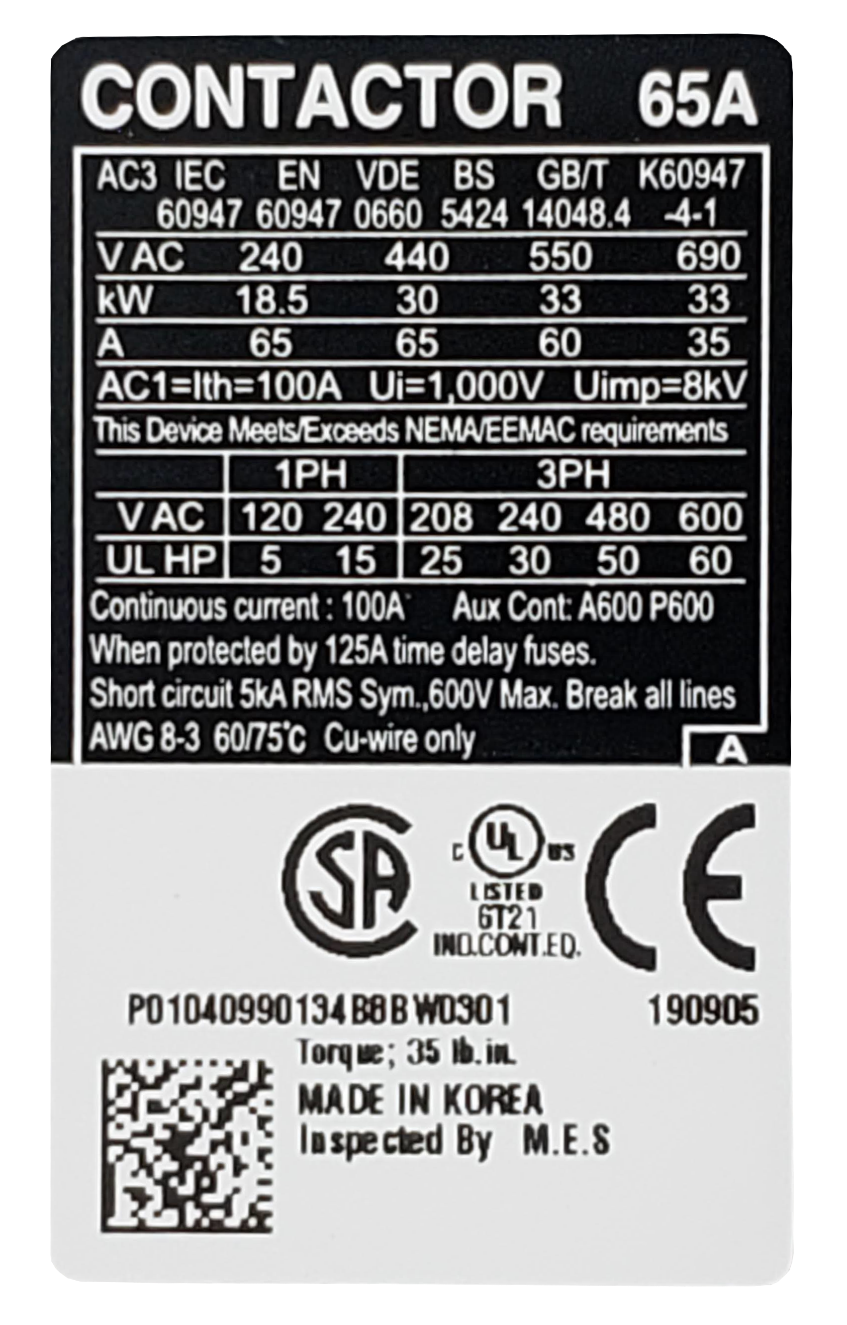 Carlo Contactor, 65A, 240v, 3ph, Lug, 2NO 2NC Aux