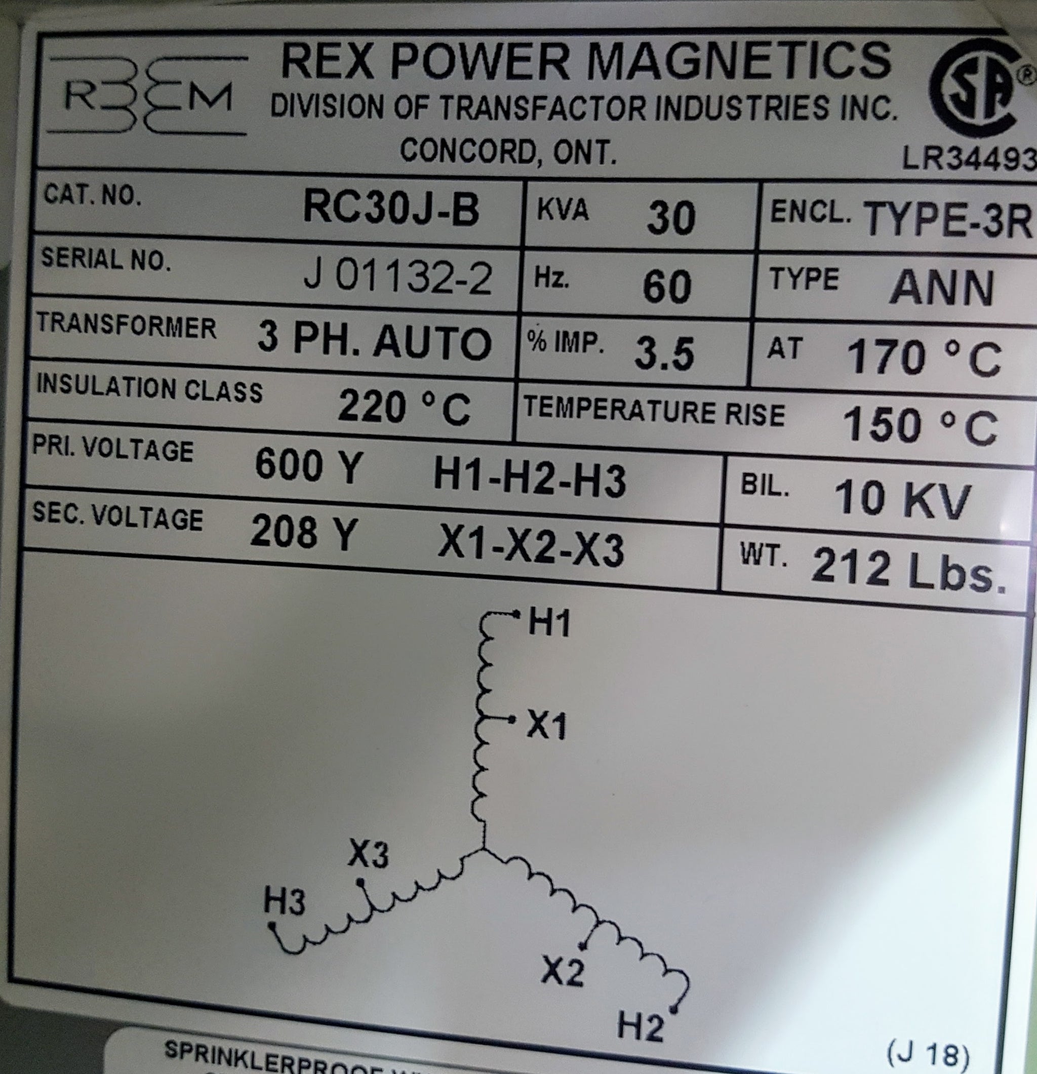 Rex Auto Transformer - 600/208v - 30KVA - 3 Phase - Copper